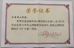 近日,2016年山东省大学生心理健康节落下帷幕。山东省委高校工委、山东省大学生心理健康教育专业委员会对2016年山东省大学生心理健康节优秀组织单位、优秀指导教师及获奖作品进行了表彰。 我校荣获2016年山东省大学生心理健康节大学生朋辈心理辅导技能大赛优...