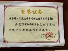 近日,山东省委高校工委下发《关于表彰2013-2014年度全省高校思想政治教育工作先进集体、先进个人的决定》(鲁高工委〔2015〕38号),我校化学与生物工程学院党支部荣获2013-2014年度全省高校思想政治教育工作先进集体称号,王玥同志荣获2013-2014年度全省高...