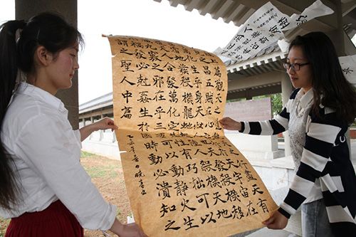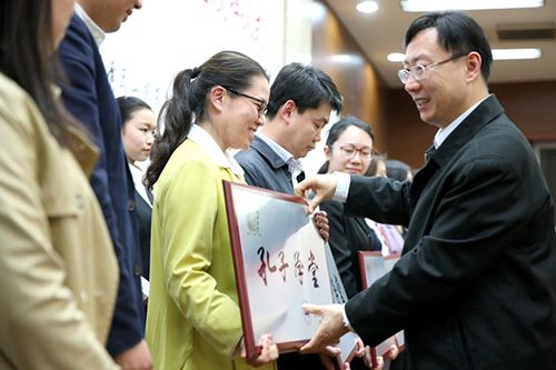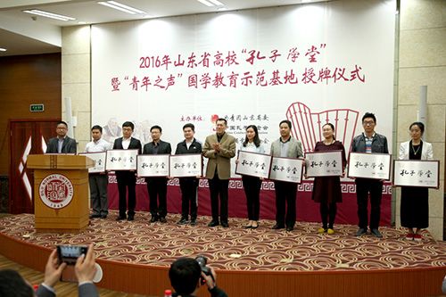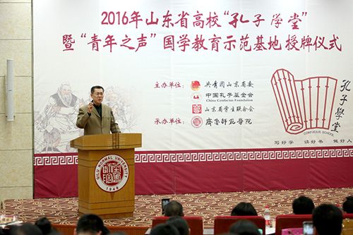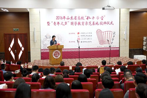 4月26日下午,山东省高校“孔子学堂”暨“青年之声”国学教育示范基地”授牌仪式在齐鲁师范学院章丘校区图书馆学术报告厅隆重举行。团省委书记张涛出席仪式并讲话,中国孔子基金会理事长王大千为全体师生讲授第一课《让国学成为青春的底色》,齐鲁师范学院党委书记尹方致欢迎词。全省52所高校团委负责人以及齐鲁师范学院师生代表共计300余人参加了仪式。 仪式伊始,中国孔子基金会文化大使、著名歌手、音乐制作人皓天演唱歌曲《孔子说》,随后,全体与会人员现场诵读了儒家经典《大学》节选。齐鲁师范学院党委书记尹方发表致辞。她指出,在高校建设孔子学堂,充分发挥高校教育教学的资源优势,对于传播孔子优秀教育思想,弘扬中华优秀传统文化,培育青年学生践行社会主义核心价值观都具有十分重大的意义,也是高校义不容辞的责任。多年来,学校秉承“博学明道,崇德象贤”的校训,将传承和弘扬中华优秀传统文化作为一种责任和担当,积极开展对中华优秀传统文化,尤其是齐鲁文化的研究。下一步,学校会以此此活动为契机,建好并用好“孔子学堂”,引导广大青年学生“道之以德,齐之以礼”,自觉学习、传承和弘扬中华优秀传统文化,培育和践行社会主义核心价值观,为建设中华民族共同的精神家园作出积极的贡献。 团省委书记张涛发表了重要讲话,他强调,全省高校“孔子学堂”要按照团省委统一部署,建设使用好“孔子学堂”,努力打造青年学生的精神家园、道德高地、信仰殿堂;要弘扬向上向善的校园文化,启发青年学生的文化自信和文化自觉;要引领青年学生健康成长,从优秀传统文化中寻找资源、汲取智慧、获得启迪。 来自山东建筑大学和山东青年政治学院的学生作为首批“孔子学堂”高校学员讲述了自已一年来在学堂中的学习经历和成长感悟。随后,与会领导为山东省高校“孔子学堂”暨“青年之声”国学教育示范基地等52所高校授牌。 仪式结束后,与会领导与来宾实地观摩了齐鲁师范学院“孔子学堂”的书法研习公开课,并观看了国学社团学生们表演的六佾舞、吟诵等内容丰富多彩的礼乐文化展示,参观了齐鲁文化长廊,大家对“孔子学堂”的建设,以及优美的校园环境和具有浓厚齐鲁文化特色的校园文化给予了高度赞扬。