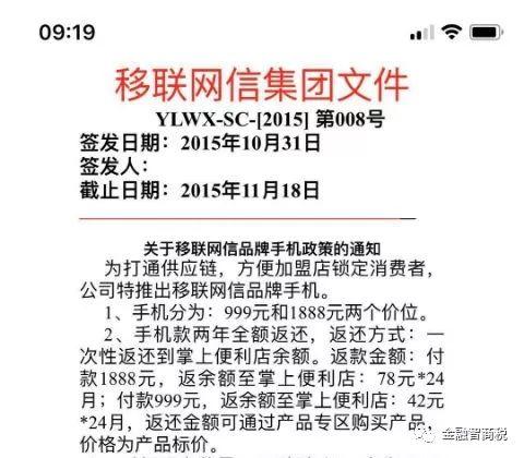 消费能全返? 难完成指标怂恿民间借贷 2015年10月,移联网信公司推出了一体机“进销存”方案,让加盟店出钱购买一体机,并存钱进去,并采取了“零元购”、“消费全返”的方式大量吸纳资金。消费者购买指定的家用电器,每个月可返还一定数额的消费金。例如,购买一台价值999元的手机,消费者购买后分24个月每月返还42元消费金,两年共返回1008元的消费金。消费金可在“掌上便利店”的购物专区购买成品使用。